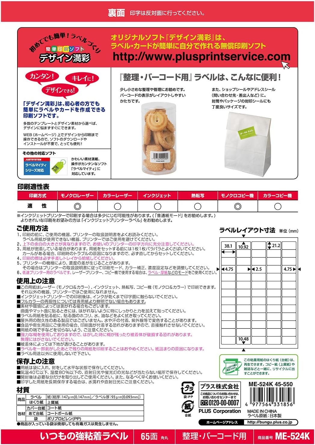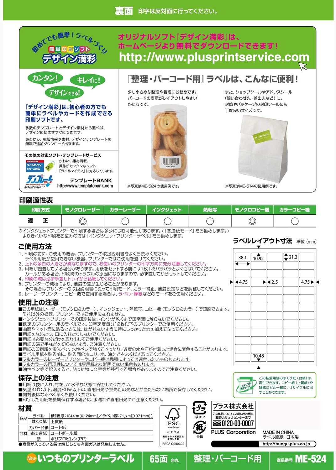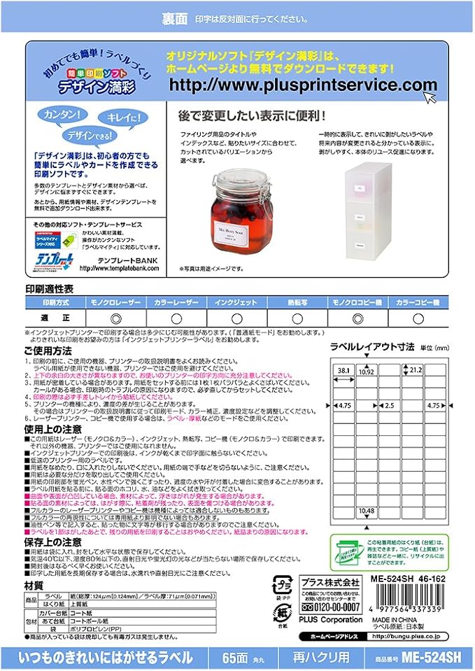 プラス ラベル いつものラベル fsc認証紙 65面 100枚 me 524t 48 652