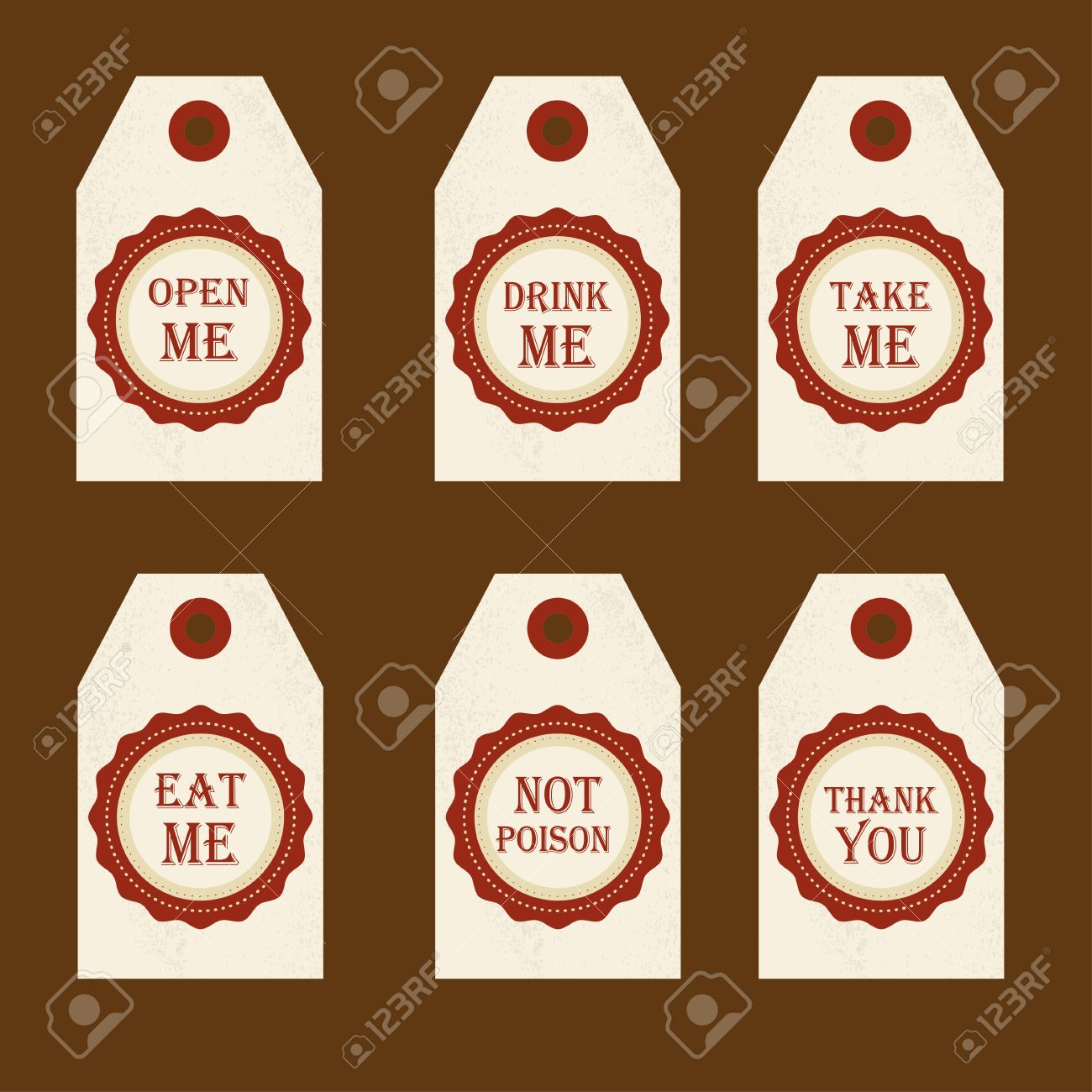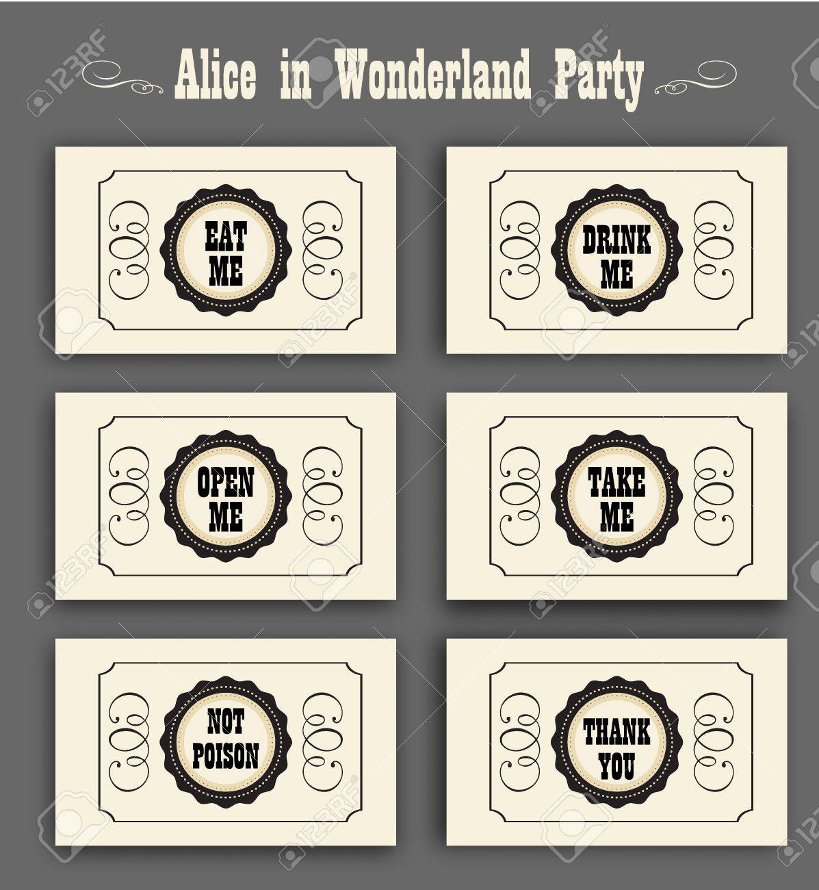 アリス不思議の国のベクトル ラベルを設定で私を食べて 私を飲む 私を開く 毒をありがとうございます 結婚式の宴会で装飾や誕生日パーティーに最適です
