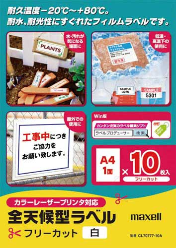 マクセル 全天候型ラベル レーザープリンタ専用 フィルム a4サイズ 10枚 cl70777 10a