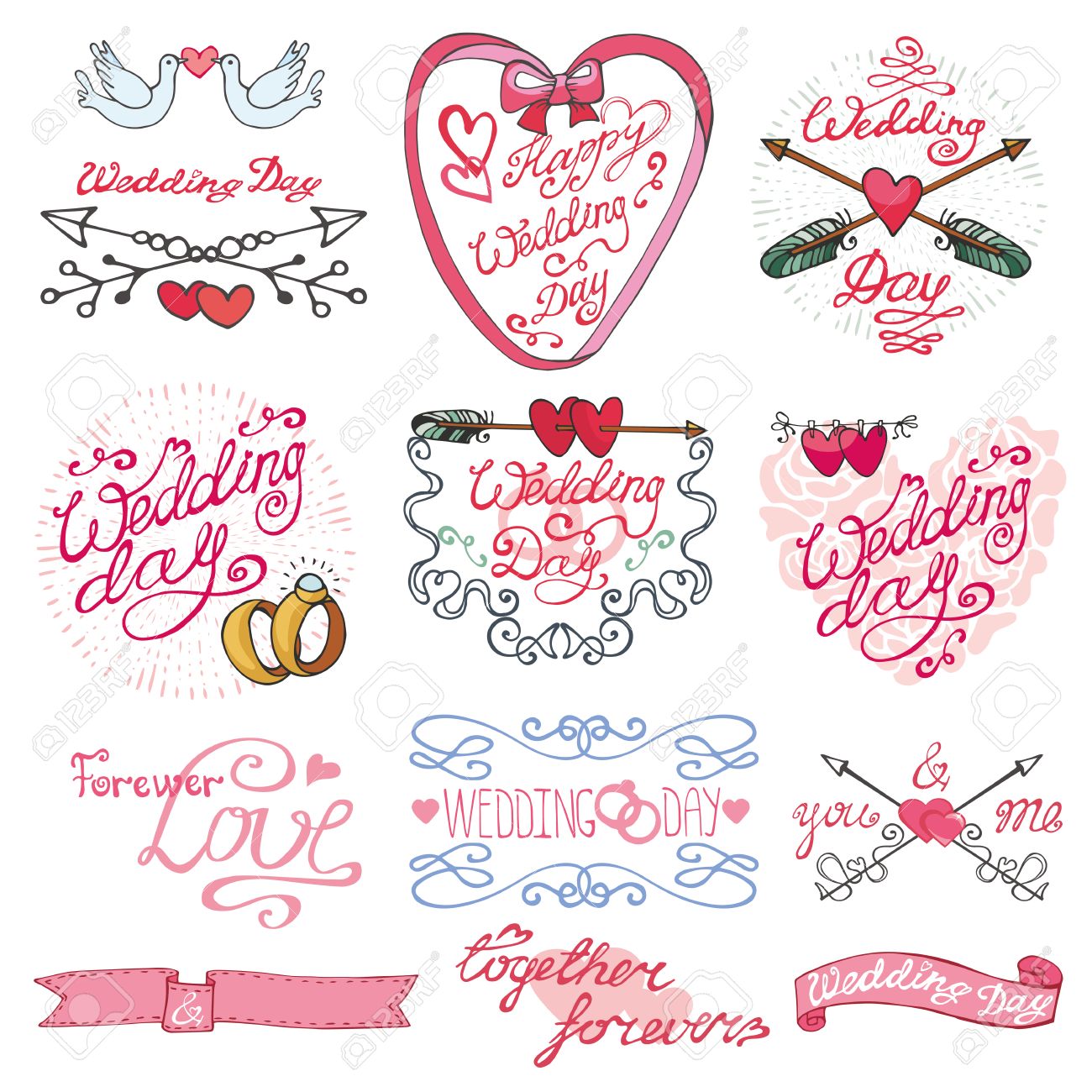 結婚 愛 ロマンチックな要素書道コレクション エンブレム 矢印 ハート 見出し まんじのラベルを付けます かわいい落書き手描きの装飾を設定します ビンテージ ベクトル レトロです