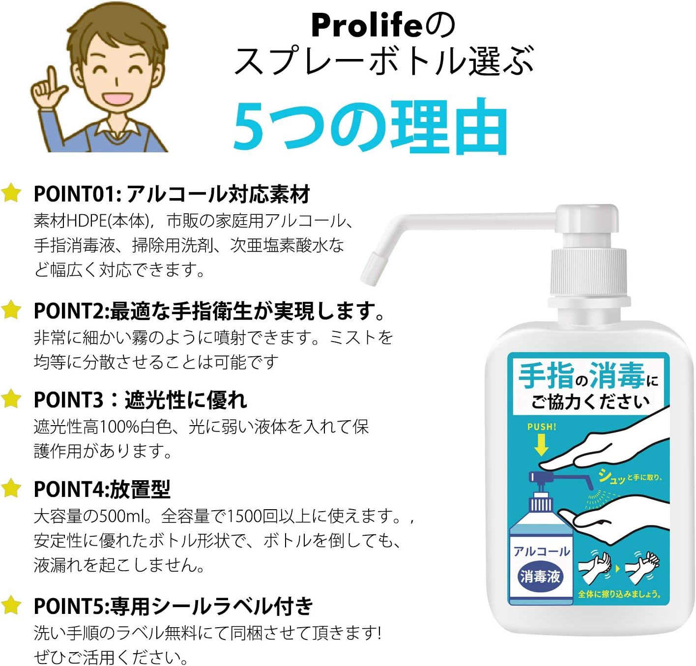 prolife スプレーボトル アルコール対応 霧吹き 500ml hdpe 遮光 噴霧器 置き型 手指消毒用 手圧ボトル 詰め替えボトル 2個セット デザイン1