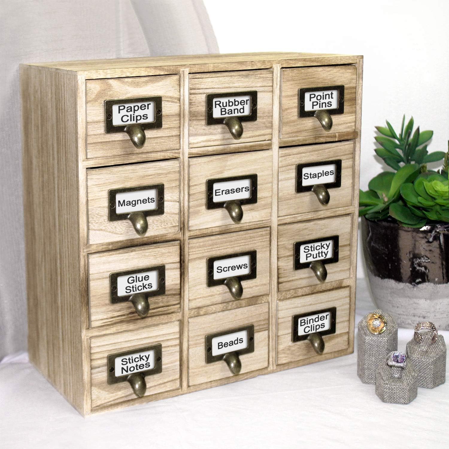 amazon ikee design 木製収納薬棚 引き出し デスクトップオーガナイザー メタルラベルホルダー付き デスクトップオーガナイザー 引き出し12個 オークカラー 幅12 1 2インチ x 奥行き6 5 8インチ x 高さ12 7 8インチ 引き出し仕切り トレー 文房具 オフィス用品