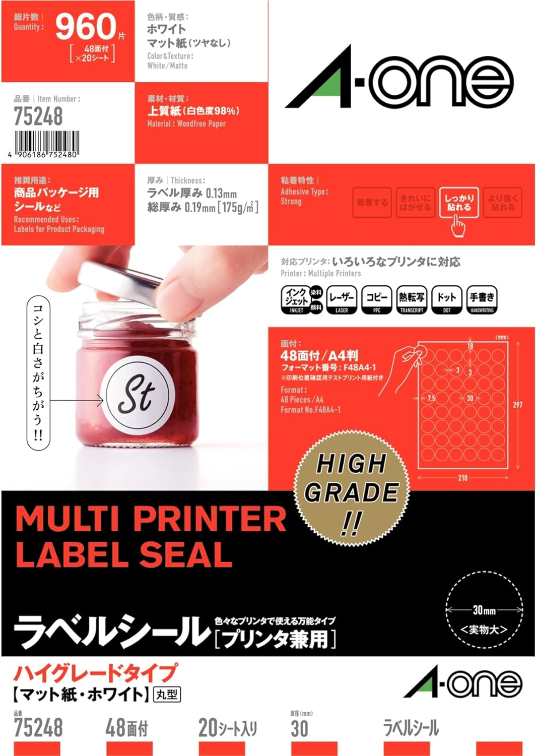 エーワン ラベルシール ハイグレード 丸形 48面 20シート 75248