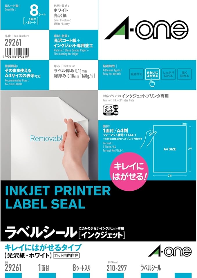 エーワン ラベルシール キレイにはがせる 光沢紙 ノーカット 8枚 29261