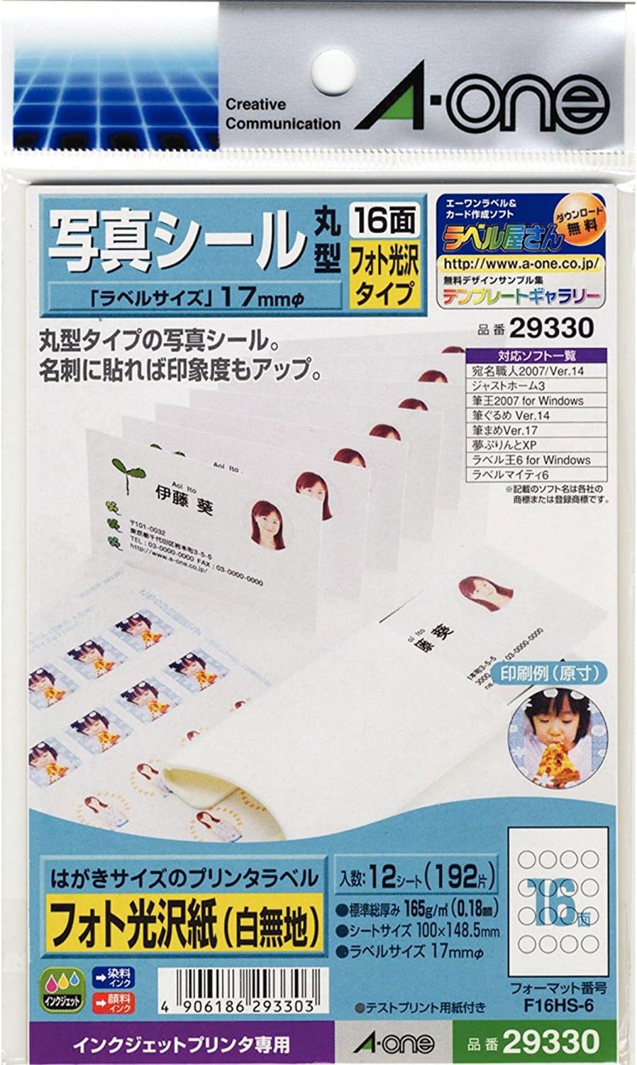 エーワン 写真シール 光沢紙 16面 丸型 12シート 29330