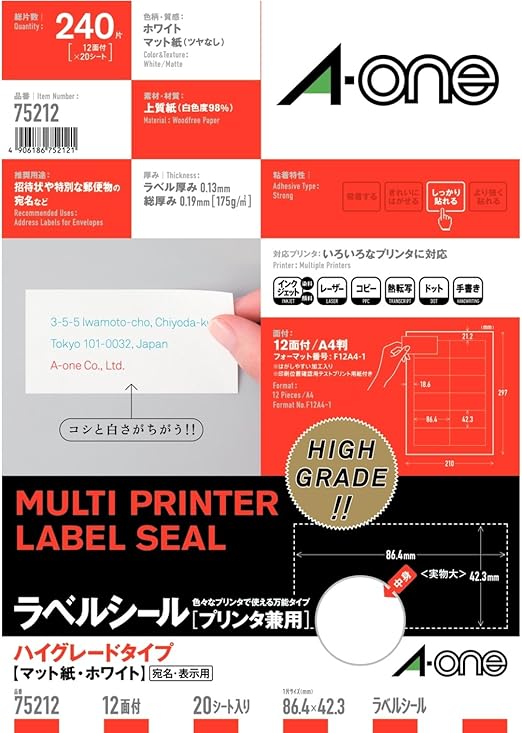 エーワン ラベルシール ハイグレードタイプ 12面 20シート 75212