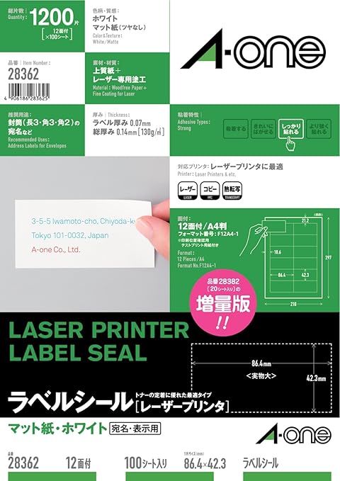 エーワン ラベルシール 表示 宛名ラベル レーザープリンタ マット紙 白 a4 12面 1袋 100シート入 28362