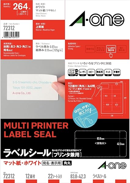エーワン ラベルシール 表示 宛名ラベル プリンタ兼用 マット紙 白 a4 12面 1袋 22シート入 72312