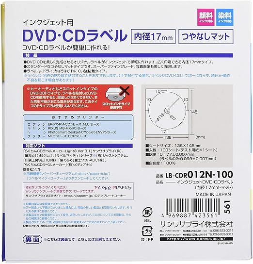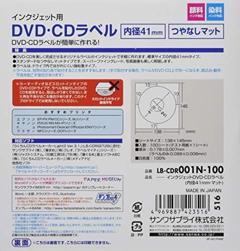 サンワサプライ インクジェットdvd cdラベル つやなしマット lb cdr001n 100